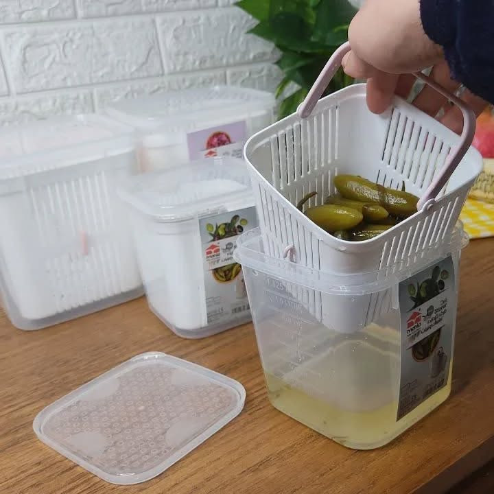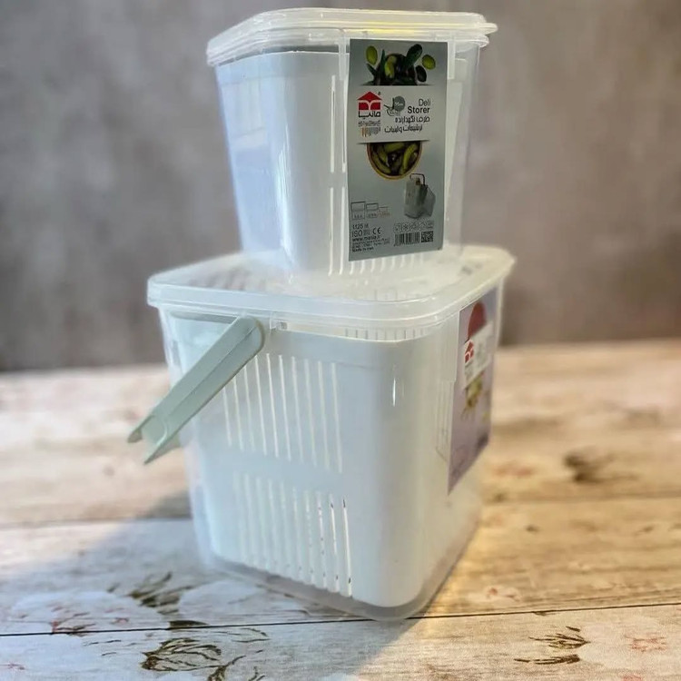تولید شده از جنس پلاستیک باکیفیت مناسب برای نگهداری در یخچال و فریزر دارای درپوش برای محافظت از محتویات داخل ظرف جداسازی آسان ترشی از داخل سرکه دسترسی به محتویات درون ظرف بصورت کامل از جنس پلاستیکی ظرف استوانهای شفاف به همراه سبد آبگیر دستهدار.