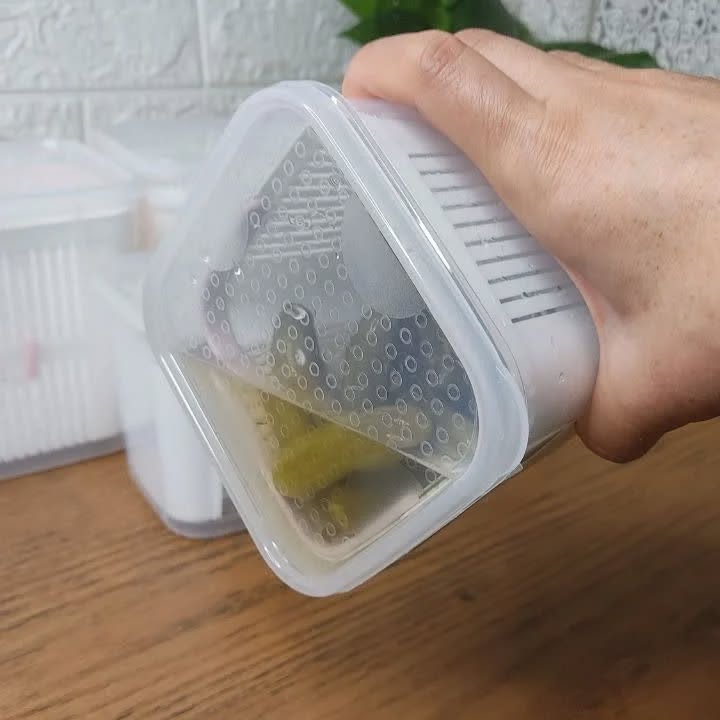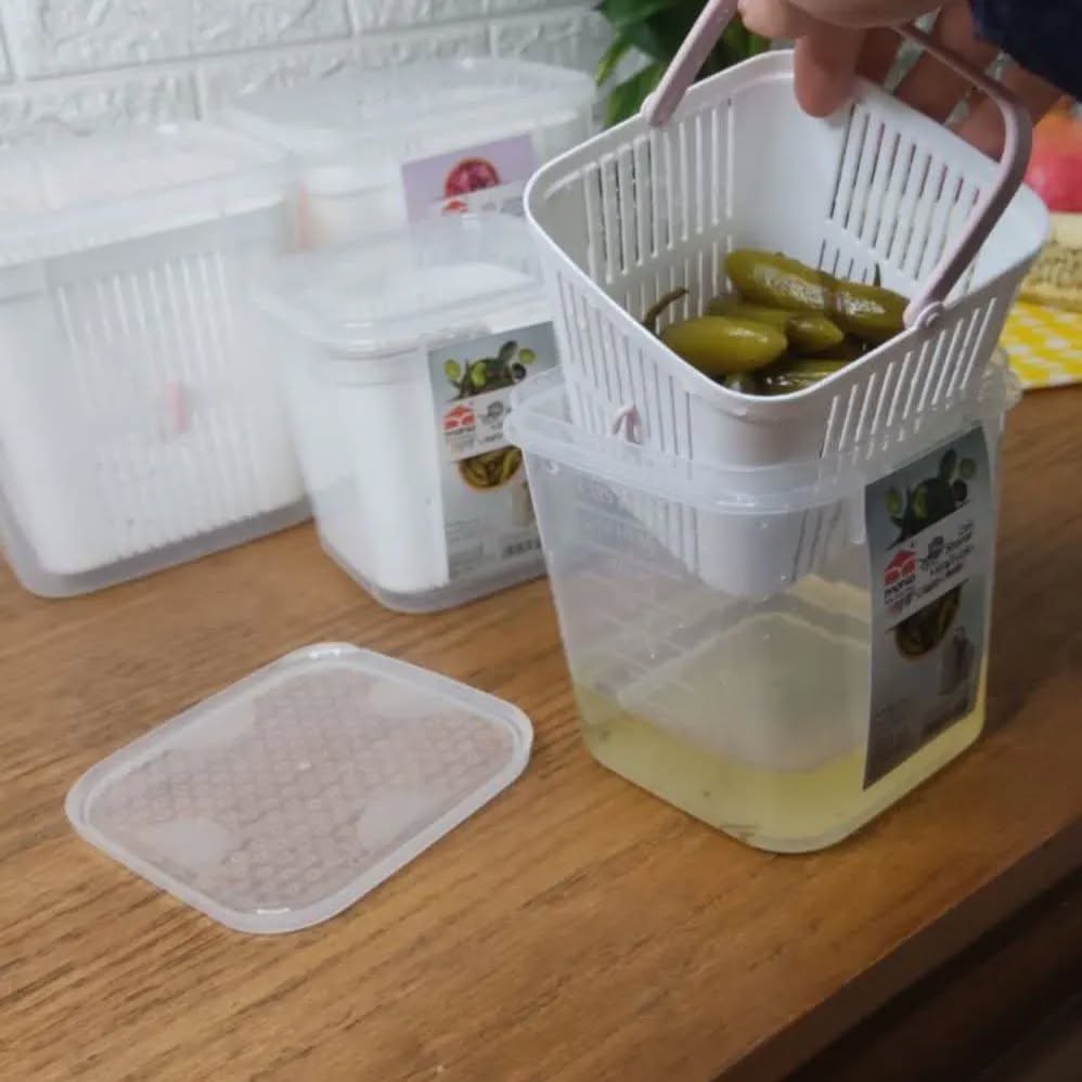 تولید شده از جنس پلاستیک باکیفیت مناسب برای نگهداری در یخچال و فریزر دارای درپوش برای محافظت از محتویات داخل ظرف جداسازی آسان ترشی از داخل سرکه دسترسی به محتویات درون ظرف بصورت کامل از جنس پلاستیکی ظرف استوانهای شفاف به همراه سبد آبگیر دستهدار.